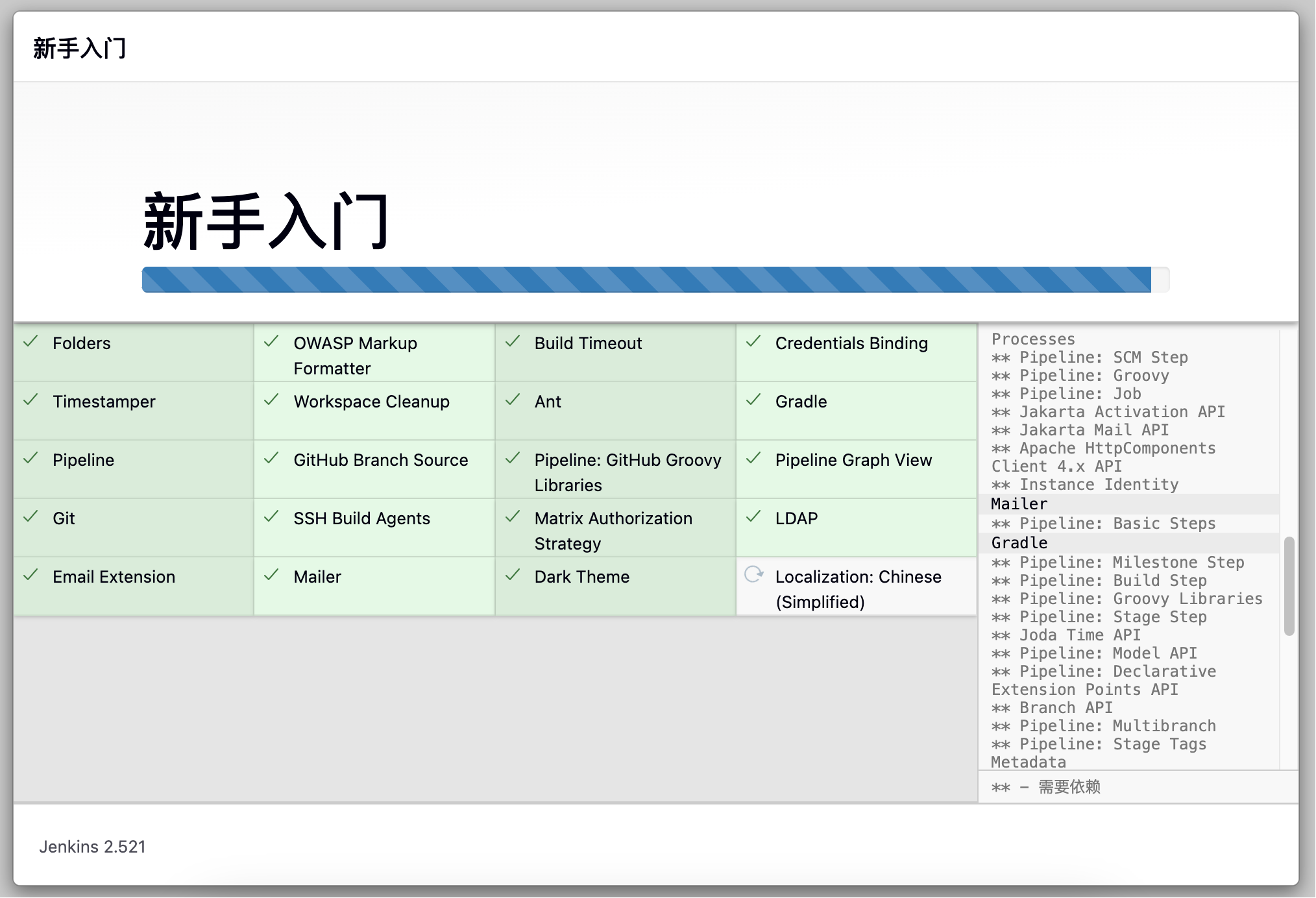 安装过程比较快5分钟左右,如果有红色的说明安装失败,可以看java启动jenkins.war时屏幕的输出日志